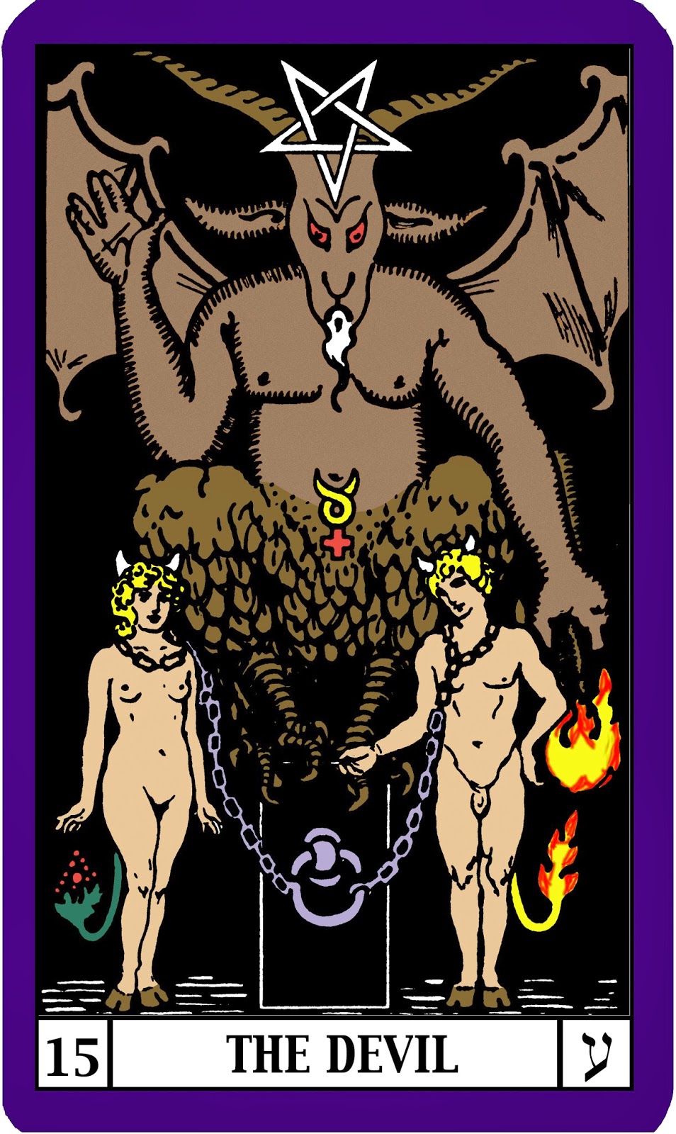 The formula of the Devil card hints that it is possible to do a supreme inverted pentagram ritual which is intended to liberate and use the divine force which is around you. If you look at the card it would suggest you would do a normal upright active or passive pentagram and then an inverted pentagram of the element. You are, using Mathers’ words working with the “eternal renewer of all the changing forces of creation in conformity with the laws of the All Powerful One.”